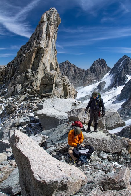The following day we trudged over Bonney Pass, where we gained then lost 1,400 feet of elevation as we dropped into the glacier valley where Gannett Peak first becomes visible. As we crested the top of Bonney Pass and beheld Gannett for the first time, we immediately recognized the dramatic beauty of the mountain. The towers around the mountain appeared as broken shards of glass hoping to tear holes through an immaculate blue sky. In the midst of these aggressive yet fragile towers draped with white blankets of ice on all sides stood one unmoving and resolute figure. With its broad, sweeping summit, Gannett seemed to draw a line in the sky between reality and dreams.