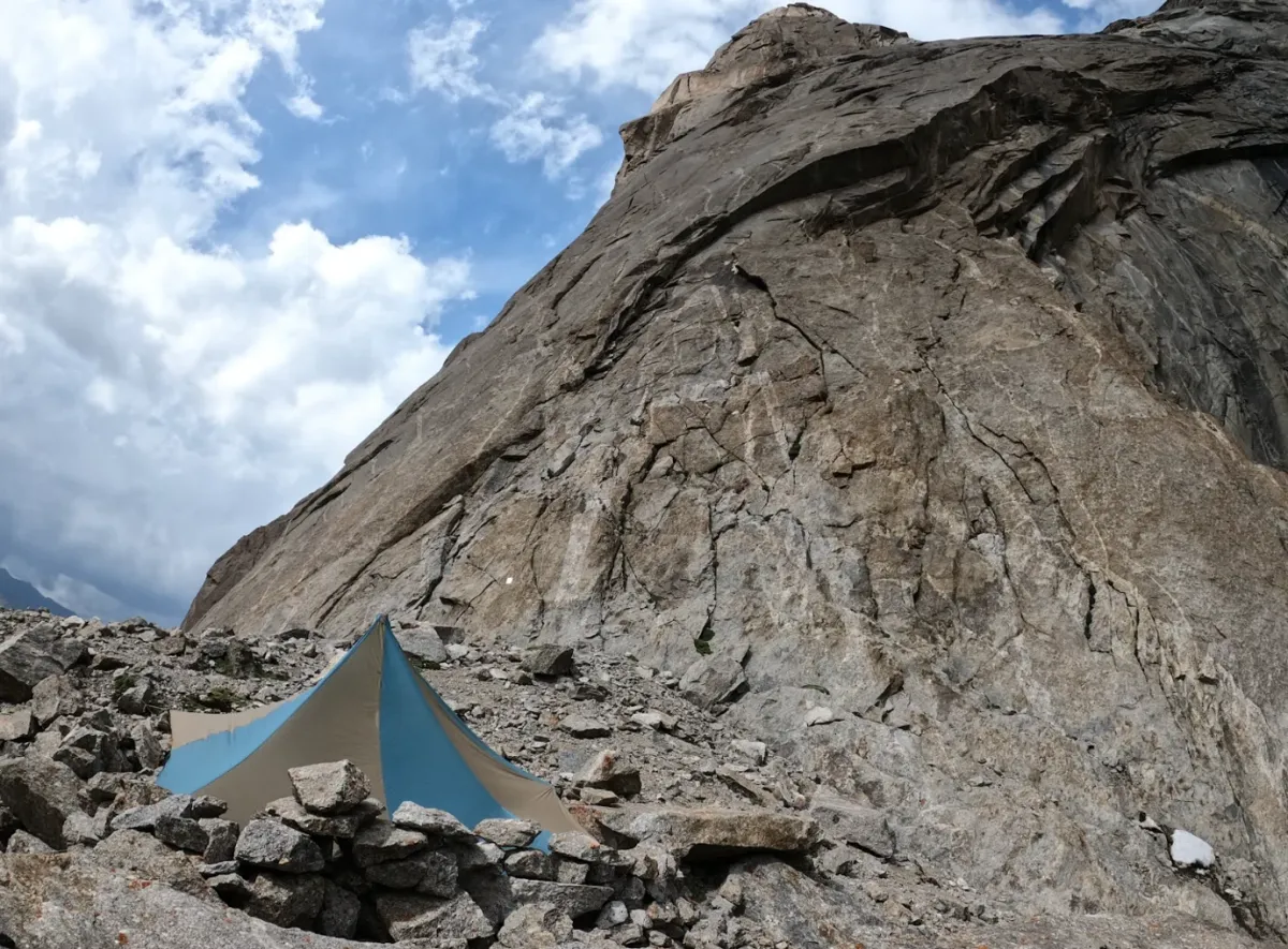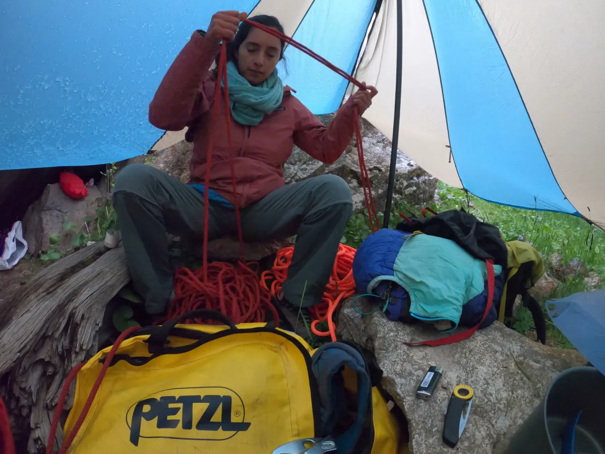 Finally, the day to try this famous continuous granite crag system arrived. We started our day at 6 a.m. The approach to the start of the route took us two hours. We brought 10 liters of water, gear, and other supplies to spend the night at the ledge. I led the first four pitches, climbing with weight, which made the wet wall intense. We arrived at the ledge around 3:0) pm, set up our tent, and Nico climbed the next pitch and left the rope fixed. Then it started raining; the forecast marked 3 mm that day. Happily dry and satisfied to have accomplished what we wanted for the day, we ate and “slept.”