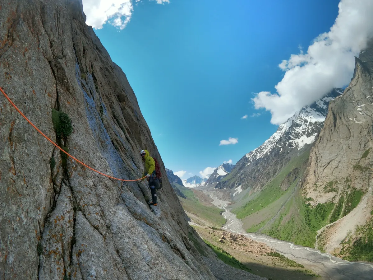 After preparing all the logistics for our adventure, we started our journey towards Ak-Su Valley. After seven hours of driving and six hours of hiking, we arrived at the place where we camped for 17 days. Weather conditions were rough the first days, with low temperatures and rain in the afternoon. On the fourth day there, we had a nice window and attempted “La Petite Ruse Tower.” We climbed the route on the right side of the wall, a beautiful 6b+, 350m. My first contact with the granite of Kyrgyzstan was incredible. The first pitch I climbed was a long 5+. The climb went smoothly, and we reached the summit around 3:00 pm. The rain threatened us for a while during the descent, but luckily it stopped. We came back to the campsite and rested for our next adventure.