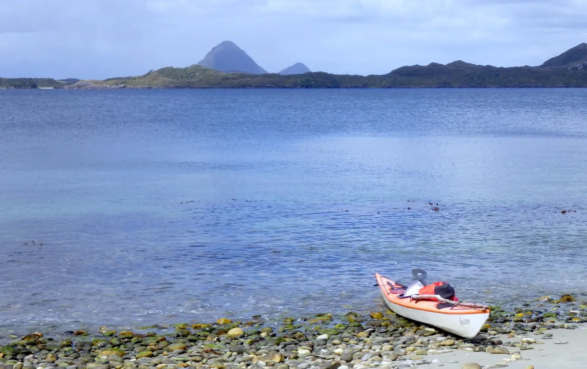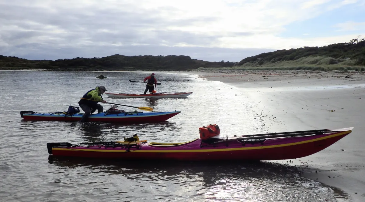 Suddenly bright colors appeared on the water as a NOLS Patagonia Semester course came around the point to share the beach with us. Photo: Steve Robitshek