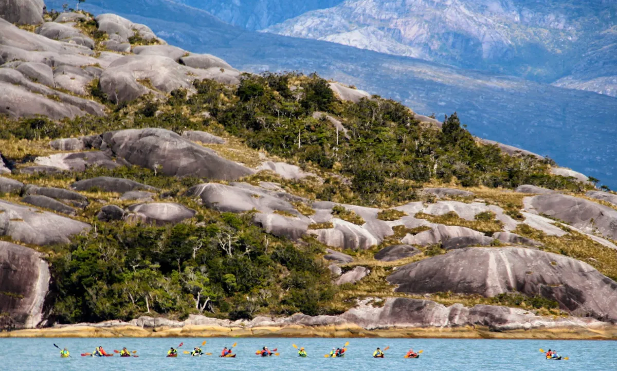 The first paddling leg had us heading further south, as we moved away from Puerto Eden. Patagonia welcomed us; a 20 knot wind building behind us with 2-3-foot seas sped us on our way. After several days of paddling, we reached our southernmost point of 50 degrees south. We kept moving and paddled nine days in a row. Now we moved west, then north into Canal Picton, where the terrain changed from the mountainous Isla Wellington to the lower, sandier islands west of Canal Picton.