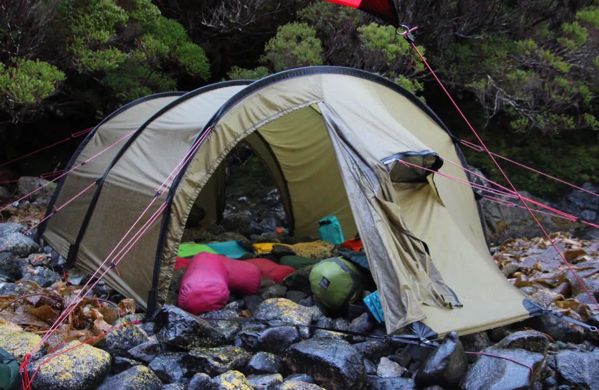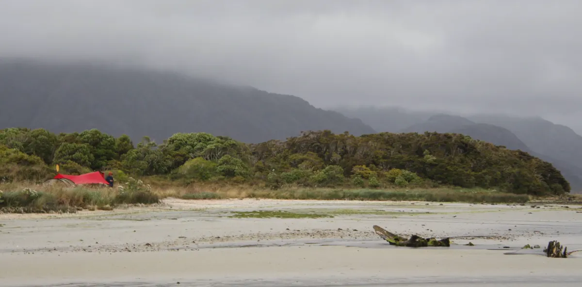 The tide should have come up to the base of the pole. Instead, we hunkered in half of the tarp. Photo: Dave Watson